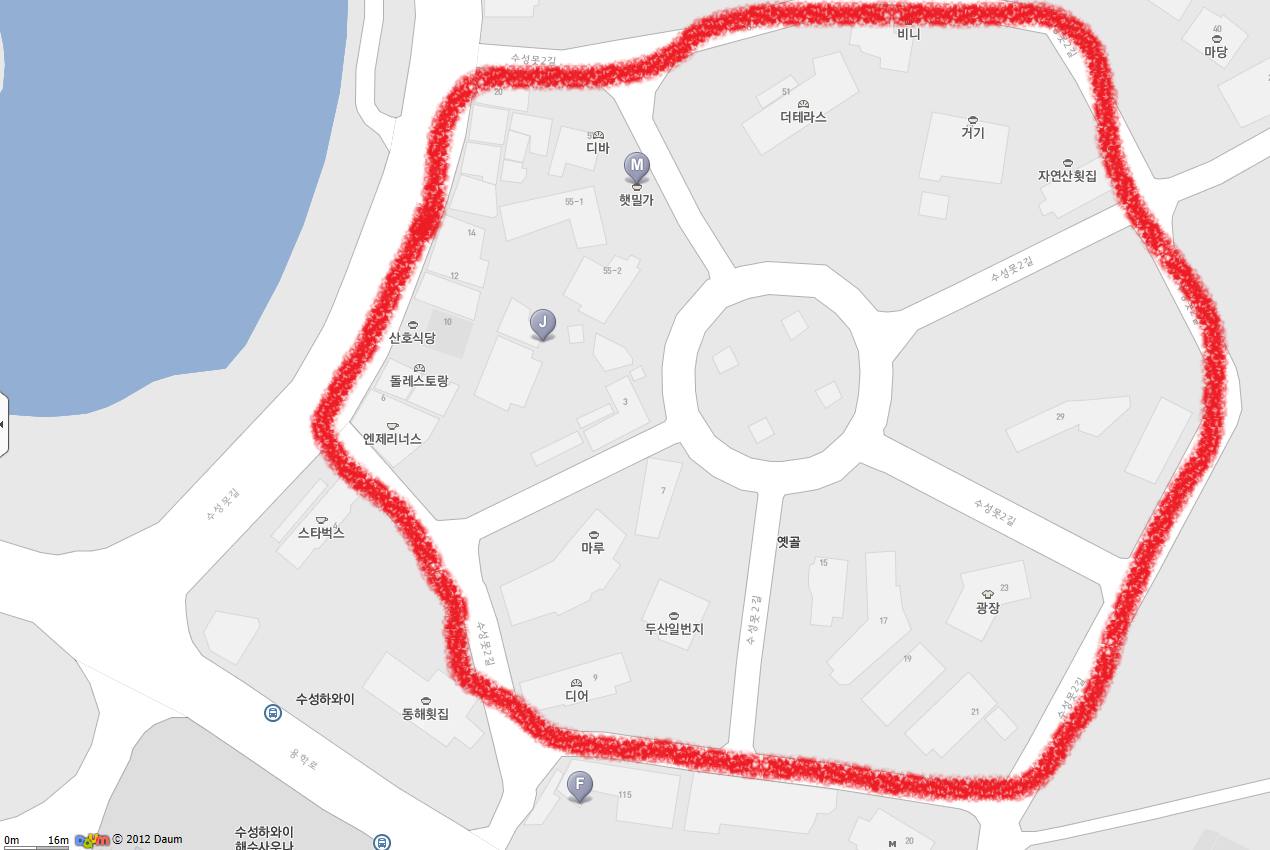 엔젤리너스 커피, 스타벅스 커피, 마루 (막창으로 유명한 곳) 근방에서 잃어버렸습니다.