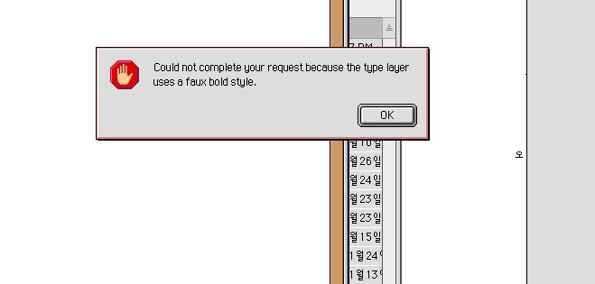 (한글버젼에서 나오는 "문자 레이어가 윤곽데이터없이 글꼴을 사용하므로 요청한 사항을 완료할 수 없습니다."라는 메시지와 같은 내용같은데요...